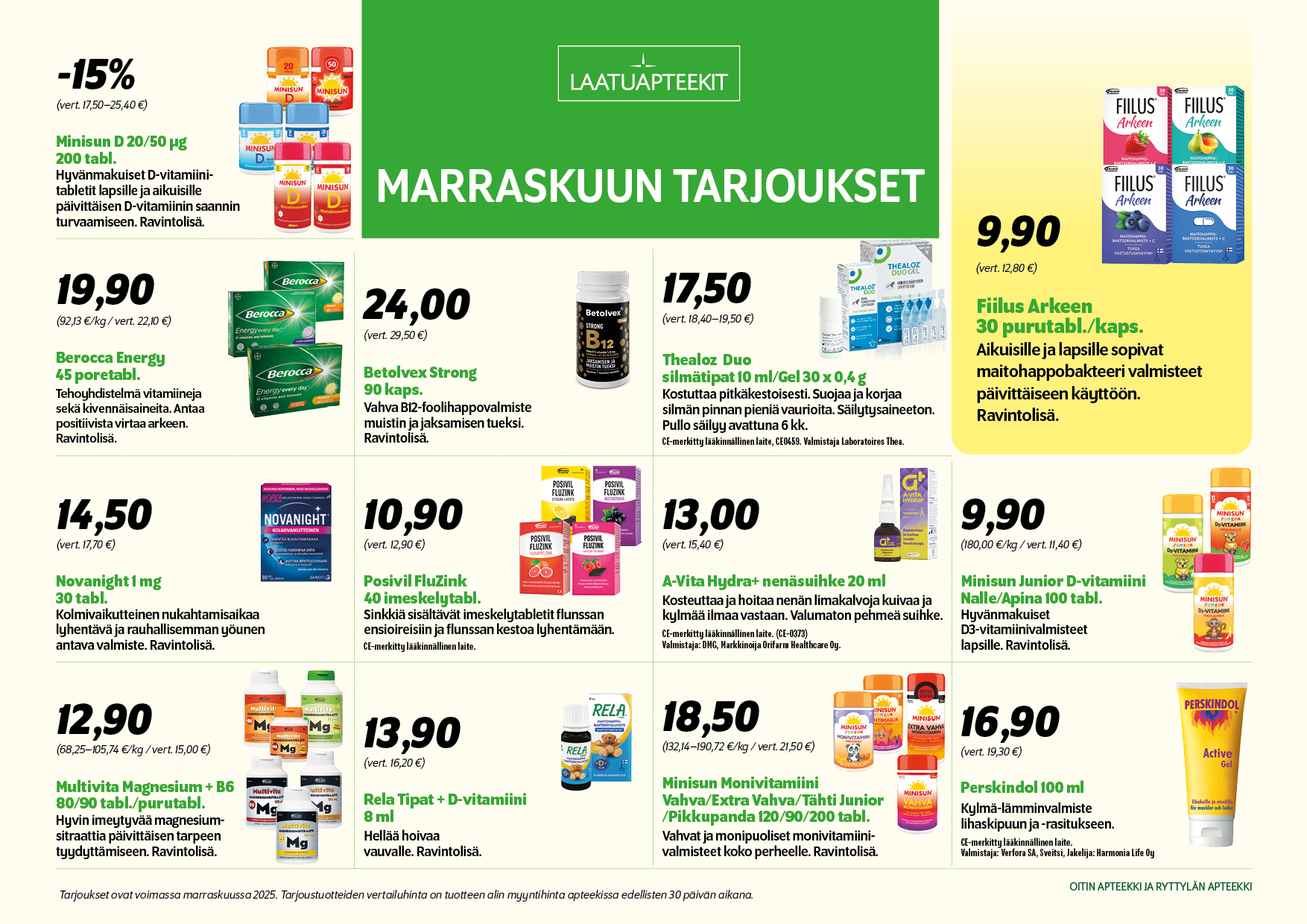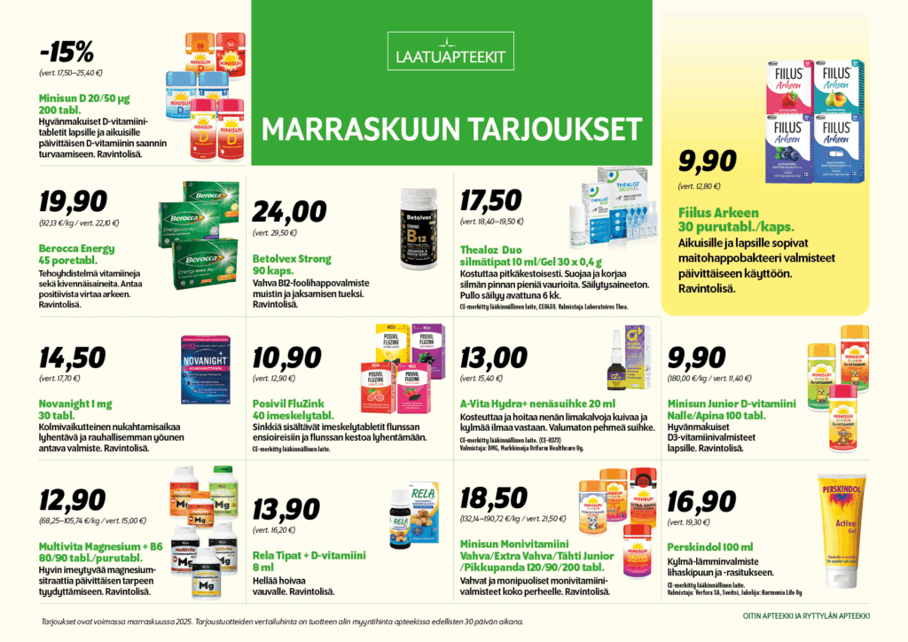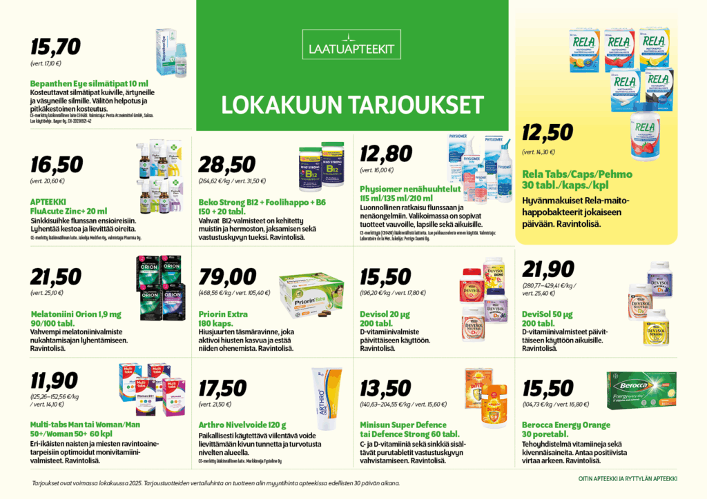 Asiantunteva, farmaseuttinen henkilökuntamme opastaa Sinua mielellään lääkeneuvontaan ja terveyteen liittyvissä asioissa. Tarjoamme myös esimerkiksi annosjakelua, lääkityksen tarkistuspalvelua, lääkehoidon arviointia ja lääkehuollon konsultaatiopalvelua.